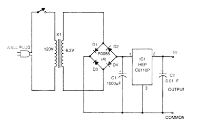 Usando el circuito 7805 como equivalente al indicado, podemos obtener 5 V con corriente hasta 1 A. Este circuito es de una antigua publicación americana. El transformador tiene corriente de secundaria de 1 A y los diodos pueden ser los 1N4002. El circuito también admite un transformador de 9 V de secundario, pues el CI hace la regulación para 5 V.