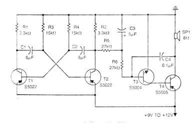 Los transistores T1 y T2 de este circuito pueden ser los BC558. T3 puede ser un BD135 y T4 un TIP42. El circuito produce un tono continuo cuya frecuencia depende de los capacitores C1 y C2. Estos capacitores se pueden cambiar para obtener el efecto de sonido deseado. El circuito es de una antigua publicación americana de 1978.