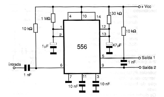 Esta no es una aplicación tan sofisticada, pues usa los dos temporizadores de un 556 en su configuración normal de monoestable. El circuito mostrado en la figura 2 produce dos intervalos de tiempo. El primero es dado por el resistor de 1 M ohmios y el capacitor de 1 uF conectados a los pines 1 y 2 mientras que el segundo intervalo es dado por el capacitor de 130 k ohms y el resistor de 47 uF conectados a los pines 12 y 13. Cuando un pulso negativo se aplica a la entrada el circuito dispara y la primera temporización comienza con la salida 1 yendo al nivel alto y la 2 permaneciendo en el nivel bajo. Al final de la primera temporización la salida 1 vuelve al nivel bajo y la salida 2 pasa al nivel alto. El circuito se puede implementar con dos 555 independientes.