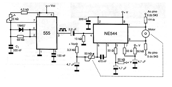 El circuito mostrado en la figura permite el control de un servomotor a partir de un oscilador remoto usando un 555. Además del circuito integrado 555 el circuito utiliza un NE544 que es un amplificador para control de servo que ya posee las etapas de potencia para este tipo de aplicación. Observe que el servo usado tiene un potenciómetro de realimentación de 50k ohms que determina su posición. De esta forma, la tensión generada por el 555 que es función de su frecuencia va a ser comparada con la tensión dada por la posición del potenciómetro de realimentación determinando así su posición de parada. En otras palabras, en este circuito la posición del servo depende de la frecuencia del oscilador formado por el 555. El NE544 no es un componente fácil de obtener.