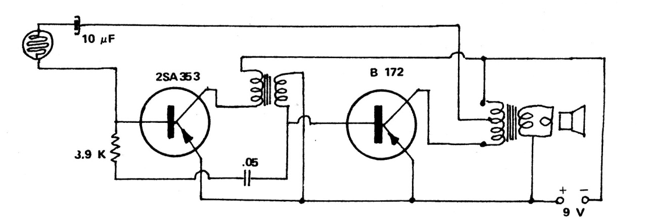 La incidencia de luz en el LDR hace que este circuito entre en funcionamiento emitiendo un sonido cuya frecuencia depende del transformador de salida y del capacitor. El circuito puede ser elaborado con transistores PNP modernos como el BC558, y los transformadores pueden ser obtenidos de antiguas radios transistorizadas fuera de uso. El circuito funcionará también con una alimentación de 6 V.