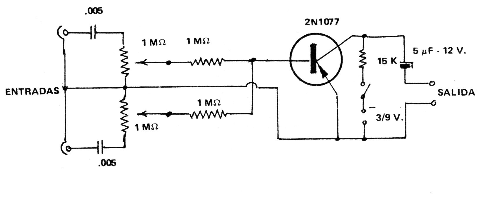 El transistor de este mezclador antiguo puede ser el BC558 y la alimentación se puede realizar con pilas, batería o fuente. Los cables de entrada y salida de señales deben ser blindados. El consumo es muy bajo y más entradas se pueden agregar al circuito.