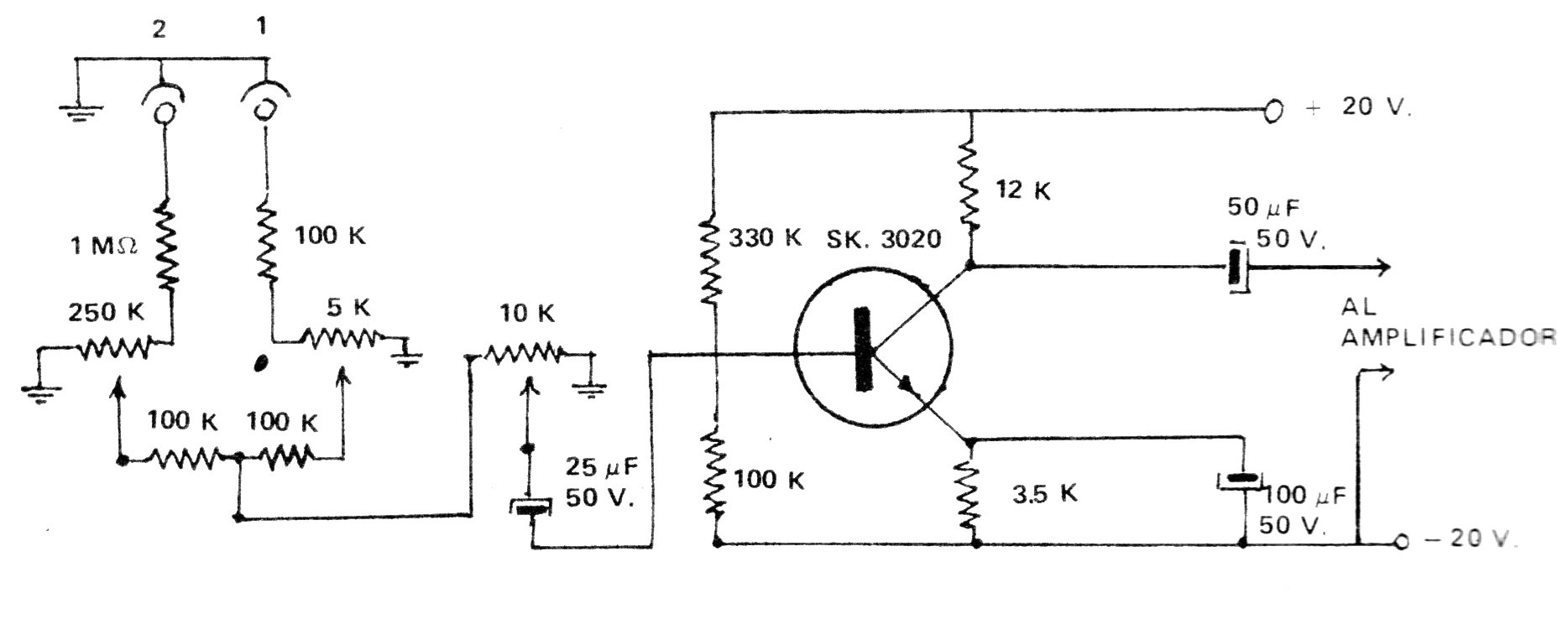 Este circuito, de una antigua publicación de los años 1970, puede ser fácilmente elaborado en nuestros días con un BC548 o BC549. El circuito puede ser alimentado con tensiones de 15 a 22 V obtenidas del propio amplificador con el que va a operar. Se pueden agregar más entradas y los potenciómetros pueden tener valores actuales como 220k en lugar de 250k. Los cables de entrada y salida deben ser blindados.