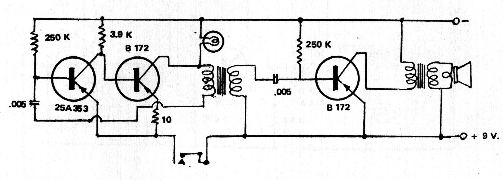 Encontramos este circuito en una publicación de 1978. Puede ser implementado con transistores modernos como los BC558, si los transformadores se encuentran. El primero es un driver y el segundo un transformador de salida. La lámpara puede ser de 50 mA a 6 o 12 V, según la tensión utilizada en la alimentación. El condensador junto al resistor de 250k (220k) determina la frecuencia del sonido producido.