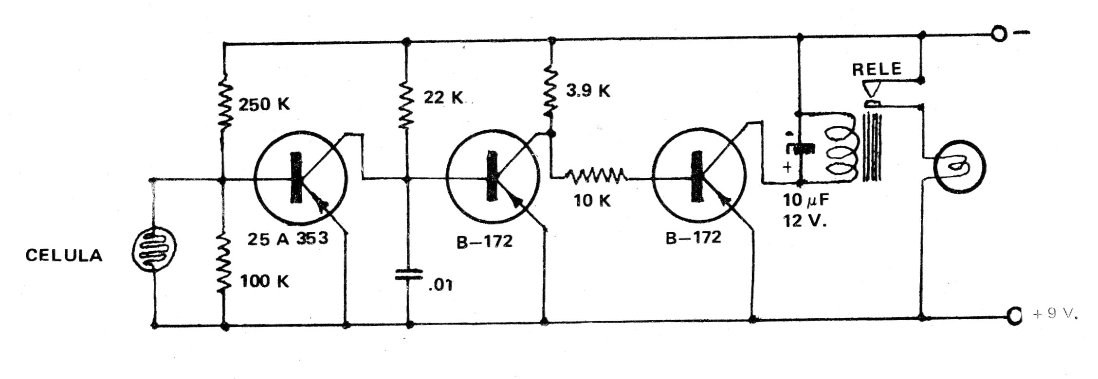 Este antiguo circuito que hace uso de transistores de germanio, puede ser modernizado con el uso de transistores de silicio como los BC558. El relé puede ser de 6 o 12 V según la alimentación usada y el LDR es común. El resistor de 100k en paralelo con el LDR puede ser cambiado por un potenciómetro del mismo valor para ajuste de sensibilidad.