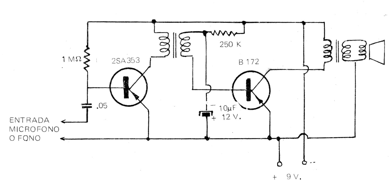 El primer transformador es un driver encontrado en radios transistorizados y el segundo un pequeño transformador de salida. Los transistores originales son de germanio, pero se pueden utilizar tipos de silicio como el BC558 y la alimentación quedará entre 6 y 9 V. El circuito es de una publicación de los años 1970.