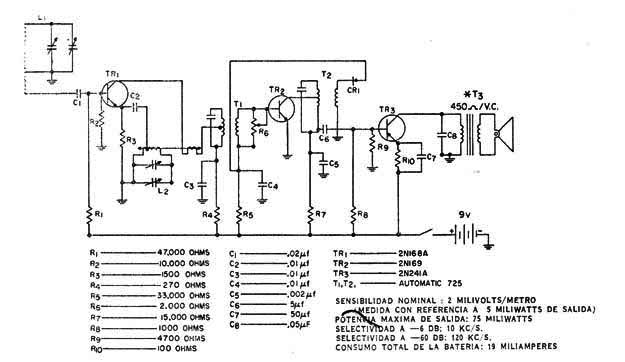 Encontramos este circuito en una documentación de 1958. En ese momento estos receptores simples eran comunes. El circuito utiliza transistores de germanio originalmente y es adecuado para la gama de onda media. La bobina puede estar hecho con 30 + 70 vueltas de alambre 26 o 28 en una barra de ferrita.