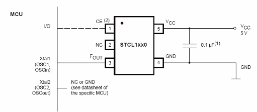 En la figura tenemos un oscilador para microcontroladores capaz de operar en las frecuencias de 10, 12 o 16 MHz, totalmente basado en el silicio. El oscilador se basa en los circuitos integrados STCL1100 (10 MHz), STCL1120 (12 MHz) y STCL1160 (16 MHz). El circuito de precisión del 1,5% y opera con 5 V +/- 10%. La salida es compatible con CMOS push-pull, con señal cuadrada. Ningún componente externo es necesario y el envoltorio es SOT23-5L. Los recursos de arranque rápido y estable están presentes en el componente. El circuito es sugerido por STMicroelectronics (www.st.com) y más información se puede obtener en el datasheet.