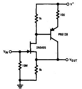 Este circuito fue encontrado en el FET Databook del National Semiconductor de 1977. El FET puede ser el BF245 y el transistor bipolar un BC558. La tensión de alimentación debe estar entre 5 y 15 V. El circuito amplifica señales hasta algunos megahertz.