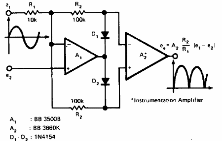 Este rectificador de señales de precisión se obtuvo en una documentación técnica americana de 1975. Los amplificadores operacionales pueden ser los 741 y la alimentación debe realizarse a partir de una fuente simétrica.