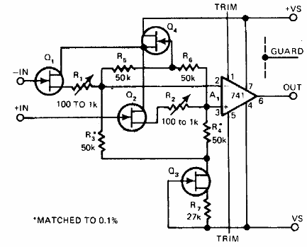 Este circuito requiere una corriente de entrada de sólo 20 fA (femto ampères) lo que corresponde a una resistencia de 1015 ohmios. Los FET pueden ser los BF245 y la alimentación puede ser hecha con fuente simétrica de 6 o 12 V. El circuito requiere cuidados extremos con el layout dada su enorme sensibilidad.