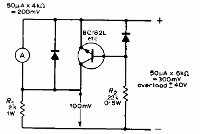 Encontramos este circuito en una publicación de 1972. El transistor puede ser el BC558. Los diodos pueden ser los 1N4148. El circuito conduce la corriente cuando supera un valor determinado, evitando así la sobrecarga del instrumento.