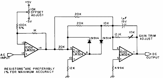 Esta configuración fue encontrada en una documentación técnica de 1978. Lo que el circuito hace es convertir una tensión AC en el valor RMS correspondiente DC para excitación de un instrumento o microcontrolador. Se pueden experimentar amplificadores operativos equivalentes.