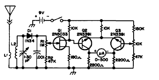 Este instrumento fue encontrado en una publicación para radioaficionados de 1973. El circuito sintonizado consiste en 11 espiras de hilo 28 en forma de 1 cm sin núcleo para el rango de 13 a 24 MHz. L1 consiste en 5 espiras del mismo hilo sobre L2. La variable es de una radio común AM. El FET puede ser el BF245 y los demás transistores BC548. La antena es telescópica de 60 a 100 cm.