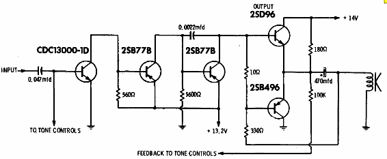 Este circuito de algunos vatios de salida es de una publicación de 1971. Podemos montarlo con transistores modernos como los BC548 para el preamplificador BC558 para los controladores y el par BD135 y BD136 para los transistores de salida. El altavoz es de 8 ohms.