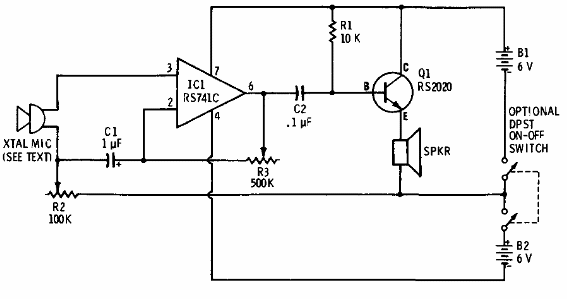 Este circuito experimental fue obtenido en una documentación de Radio Shack de 1977. El transistor puede ser el BD135 y la fuente, en realidad puede ser de 6 a 9 V simétrica. R2 ajusta la ganancia y el micrófono puede ser piezoeléctrico.