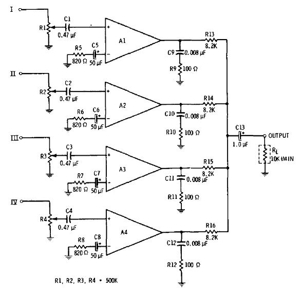 Este circuito es de una antigua documentación de la RCA (que ya no existe). Los amplificadores operacionales pueden ser tipos más comunes como los 741, alimentados por una fuente simétrica de 6 a 12 V. Los cables de entrada y salida de señales deben ser blindados.