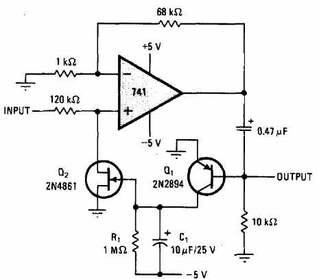 Encontramos este circuito en una documentación técnica de 1977. El FET puede ser el BF245 y el bipolar un BC558. El circuito opera con un rango de entrada de 20 mV a 20 V, con un control automático de ganancia. La fuente debe ser simétrica de 6 a 12 V.