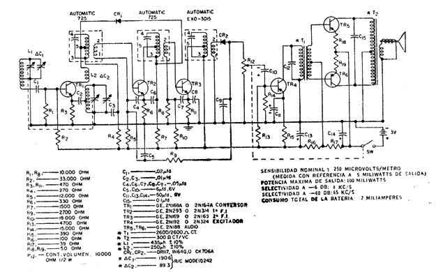 Este receptor comercial 1958 funciona con 2 pilas como de energía. El circuito utiliza transistores de germanio y otros componentes críticos son las bobinas y transformadores de audio. Los receptores de las generaciones siguientes tienen la misma configuración.