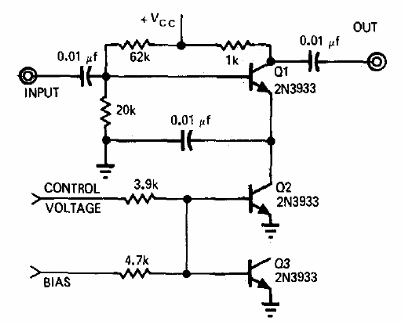 La amplificación de este circuito en un rango de 40 dB para frecuencias de hasta 10 MHz es controlada por la tensión aplicada a Q2. Los transistores bipolares pueden ser los BC548 o 2N2222. La alimentación se puede realizar con tensiones de 6 a 12 V.