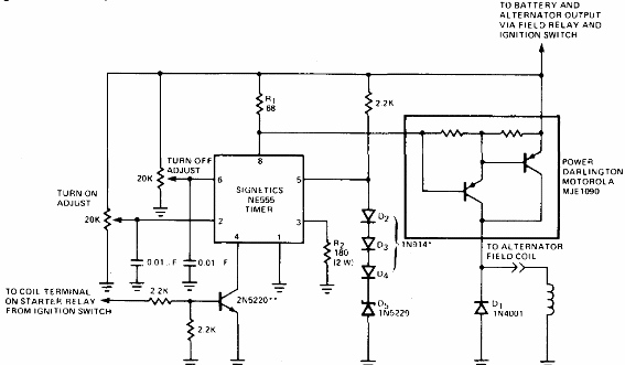Este circuito se conecta al alternador para ajustar la tensión en un automóvil. Los transistores Darlington de al menos 10 A pueden ser utilizados en lugar del original. El circuito es de un manual de Signetics de 1977.