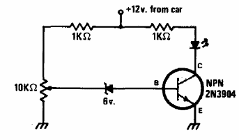 Este simple circuito monitorea el estado de una batería de un automóvil. Se encontró en una publicación de 1978. El transistor puede ser el BC548 y el ajuste del punto en que el LED se apaga se realiza en el trimpot. El zener es de 6 V, para baterías de 12 V.