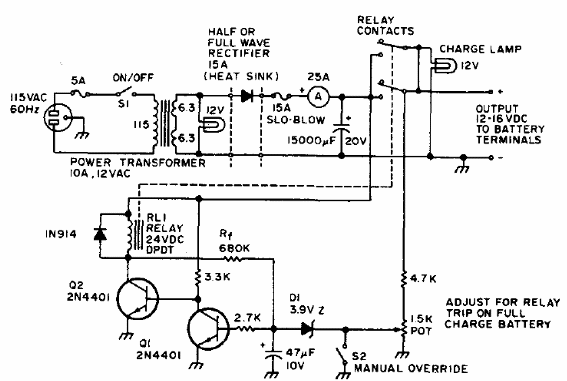 Encontramos este circuito en una publicación para radioaficionados de 1976. El circuito puede ser montado con transistores BD135 y el diodo rectificador debe ser de 20 A, así como el transformador. El ajuste para el desarme cuando la batería está cargada se realiza en el trimpot.