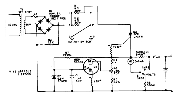 La corriente de carga de este circuito encontrado en una antigua documentación de telecomunicaciones es de 3 A, que es la corriente del secundario del transformador. Los diodos pueden ser los 1N4002 y el SCR puede ser un TIC106. El transistor unijunturaes el 2N2646 y T2 consiste en un transformador de pulsos con relación de espiras de 1: 1. El fusible es de 5 A.