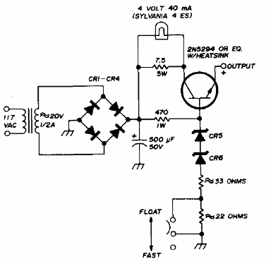 Este circuito fue obtenido en una publicación americana de 1974. Su finalidad es cargar baterías selladas (gel) que se utilizan en equipos de telecomunicaciones. El circuito tiene una salida de 14,4 V y el transistor puede ser el TIP31. Los diodos zener son de 6,1 V y los diodos 1N5404. El transformador tiene un secundario de 2 A.