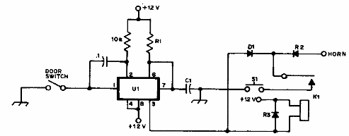 El circuito integrado utilizado en esta alarma es el 555. Encontramos esta configuración en una publicación de 1977. El relé es de 12 V de baja corriente. Para las corrientes más grandes se debe utilizar un transistor conductor. Los diodos pueden ser los 1N4002.C determina la temporización pudiendo tener valores entre 1 uF y 10 uF.