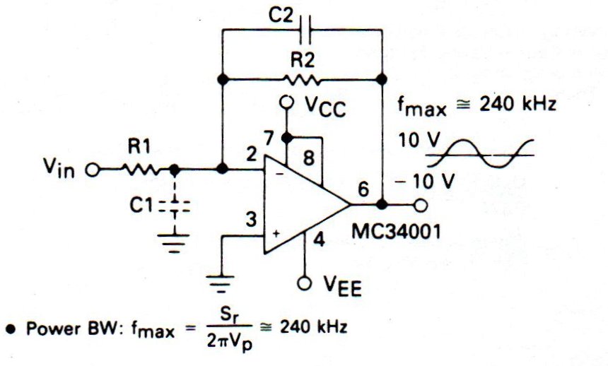 Este circuito para operacionales MC34001 y otros de la misma serie de Motorola es de un manual de los años 80. El circuito tiene un rango pasante de 240 kHz y debe ser alimentado por una fuente simétrica.