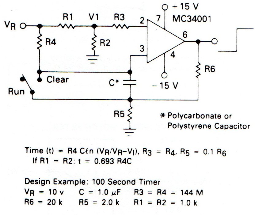 Este circuito es de un manual de Motorola de los años 80 siendo aplicados a los operacionales MC34001 y siguientes de la misma serie. Los valores para los componentes se suministran junto al diagrama, debiendo el condensador de tiempo ser de tipo de baja fuga.