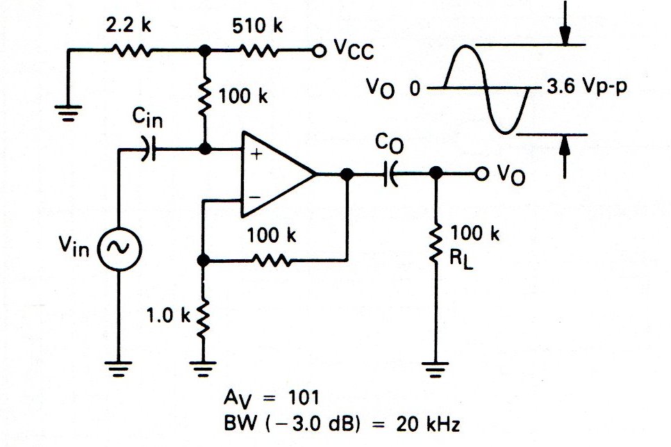 Esta es la configuración normal para un amplificador de CA con banda pasante de 20 kHz usando operaciones comunes como el MC33171, MC33172 y equivalentes de la misma serie. La fuente de alimentación debe ser de 5 V que permite utilizar el circuito como shield.