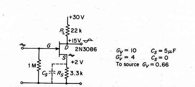 Este circuito utiliza un FET de unión, y tiene una ganancia de tensión de 10 veces. El circuito es de un documento de 1968 y sus otras características se indican en el diagrama.