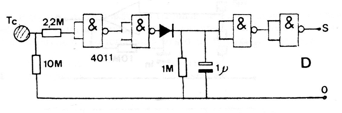 El sensor de toque de este circuito consiste en una chapa única que debe ser tocada para obtener una salida. El circuito utiliza el ruido captado por el cuerpo usando para accionar el circuito después de una detección hecha por el diodo. El circuito se puede utilizar como escudo de entrada cuando se alimenta con una tensión de 5 V.