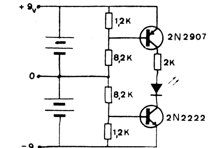 Encontramos este circuito en una documentación antigua de los años 70. Su finalidad es indicar el estado de las pilas en una fuente. El circuito puede ser implementado con transistores BC558 y BC548.