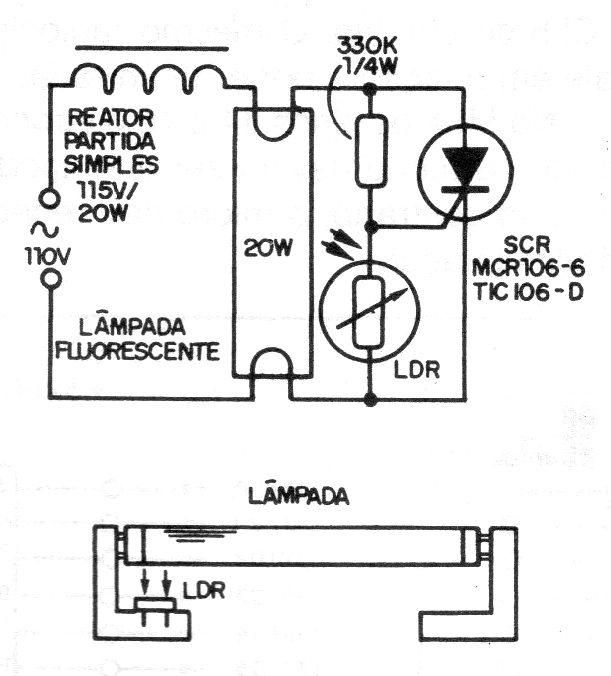 En este proyecto se muestra cómo utilizar un SCR en un circuito de starter para una lámpara fluorescente común. El SCR debe ser del tipo 106 a 400 V o más y el LDR se monta junto a la lámpara para detectar el momento del disparo.