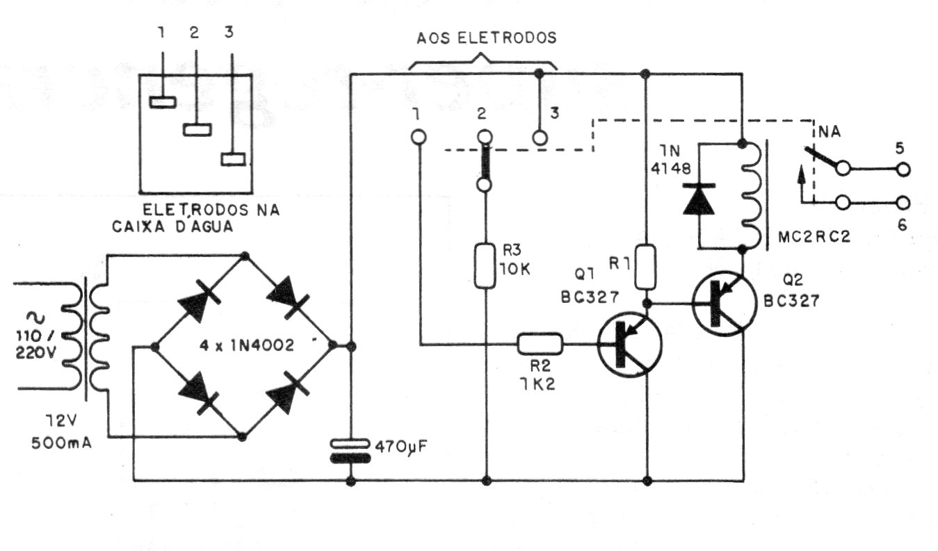 Este circuito fue encontrado en una publicación de 1990. Los sensores son electrodos colocados en la caja de agua que accionan el circuito que tiene por carga un relé. El relé puede alimentar una bomba automática o un sistema de advertencia.