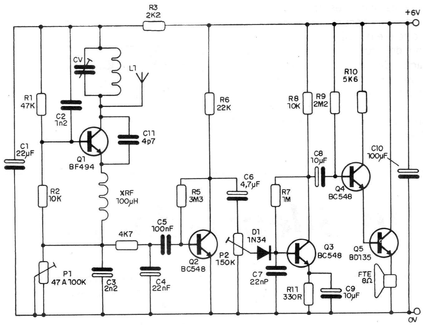 Encontramos este circuito convencional de receptor en una documentación de 1990. El circuito incluye un paso amplificador de audio, debiendo ser alimentado por fuente de 6 V con al menos 300 mA, dado su consumo. La bobina consta de 4 espiras de hilo 22 o 24 en forma de 1 cm sin núcleo y la antena es telescópica.