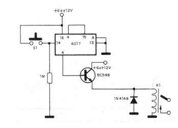 Este circuito utiliza un interruptor de presión para encender o apagar un relé. La alimentación debe ser de 6 o 12 V según el relé utilizado. El cable hasta el interruptor de control debe ser corto para evitar problemas de ruidos y repiques.