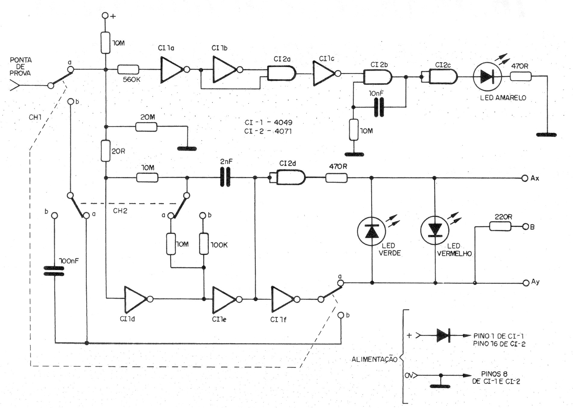 Encontramos este circuito en una documentación de 1990. Funciona con la alimentación del propio circuito digital que está siendo probado. Se pueden probar circuitos TTL o CMOS y también tenemos la indicación del tercer estado para lógica tri-state.