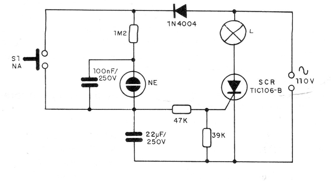 Este circuito es de una documentación de 1990. Cuando presionamos D1 la lámpara permanece encendida por un intervalo de tiempo que depende del capacitor más grande. Desactivado, el circuito funciona como un parpadeante con la lámpara de neón parpadeando en una frecuencia que depende del capacitor más pequeño.