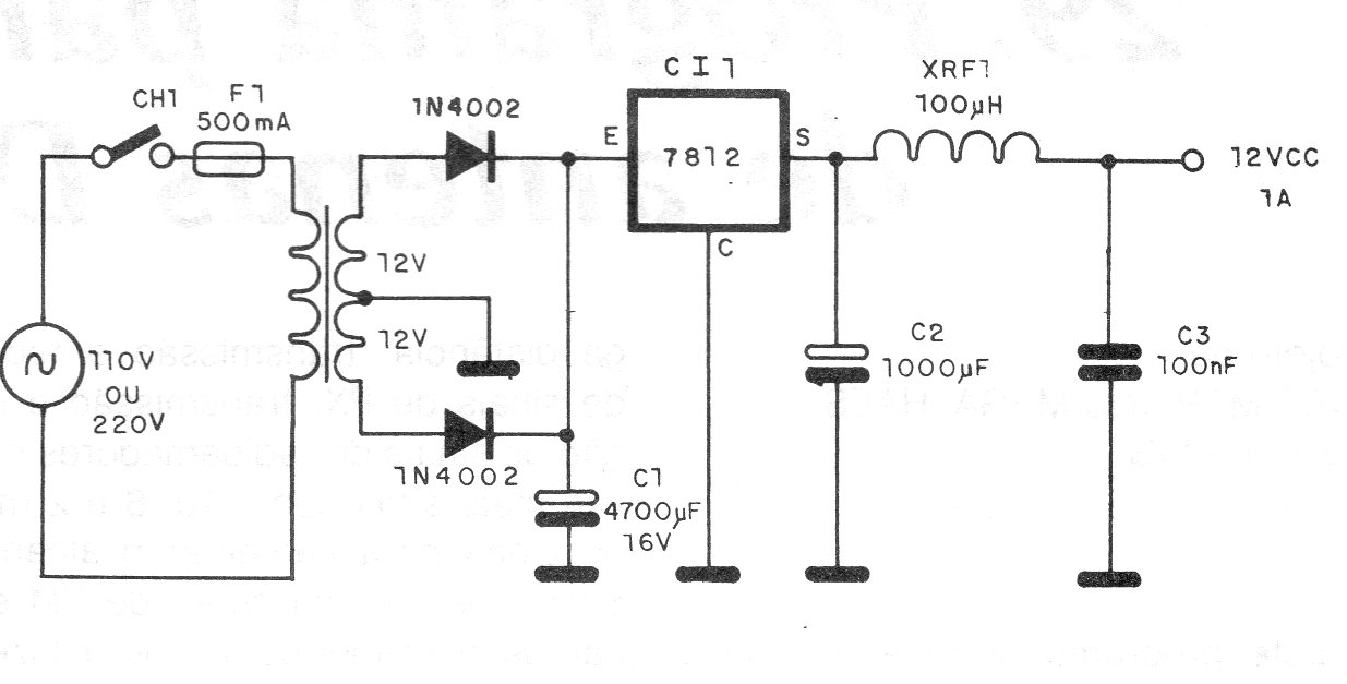 Este circuito está indicado para la alimentación de pequeños y medianos transmisores de FM que requieren 12 V bajo corriente hasta 1 A. El circuito integrado debe estar dotado de disipador de calor. El transformador tiene un secundario de 1 A.