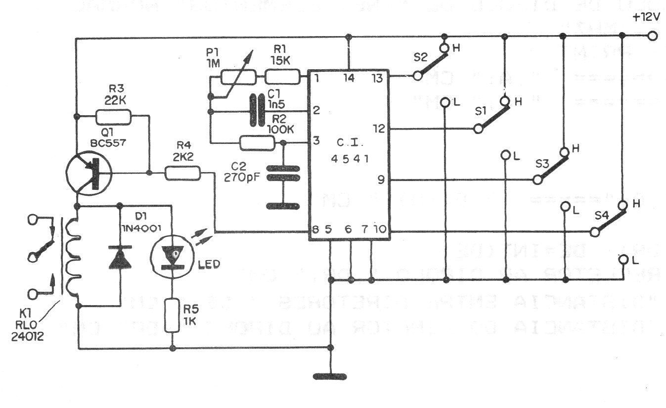 Este circuito tiene cuatro claves de programación de tiempo, según la tabla dada junto al diagrama. El circuito debe ser alimentado por tensión de acuerdo con el relé y el ajuste de las escalas de tiempo puede ser hecho a través de P1.