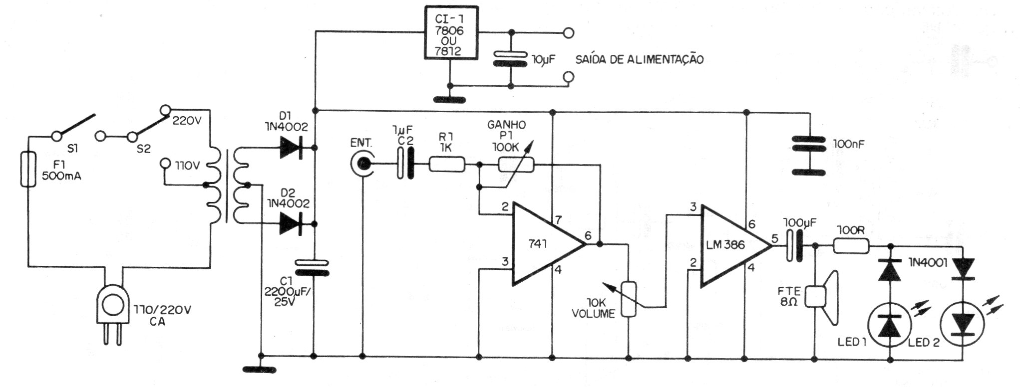 Este circuito es de una publicación de 1990, pero la idea puede ser aprovechada en un proyecto actual para alimentación de multimedia y otros aparatos de sonido alimentados por pilas. El circuito incluye un pequeño amplificador y una versión estéreo deben montarse dos canales similares con una fuente única.