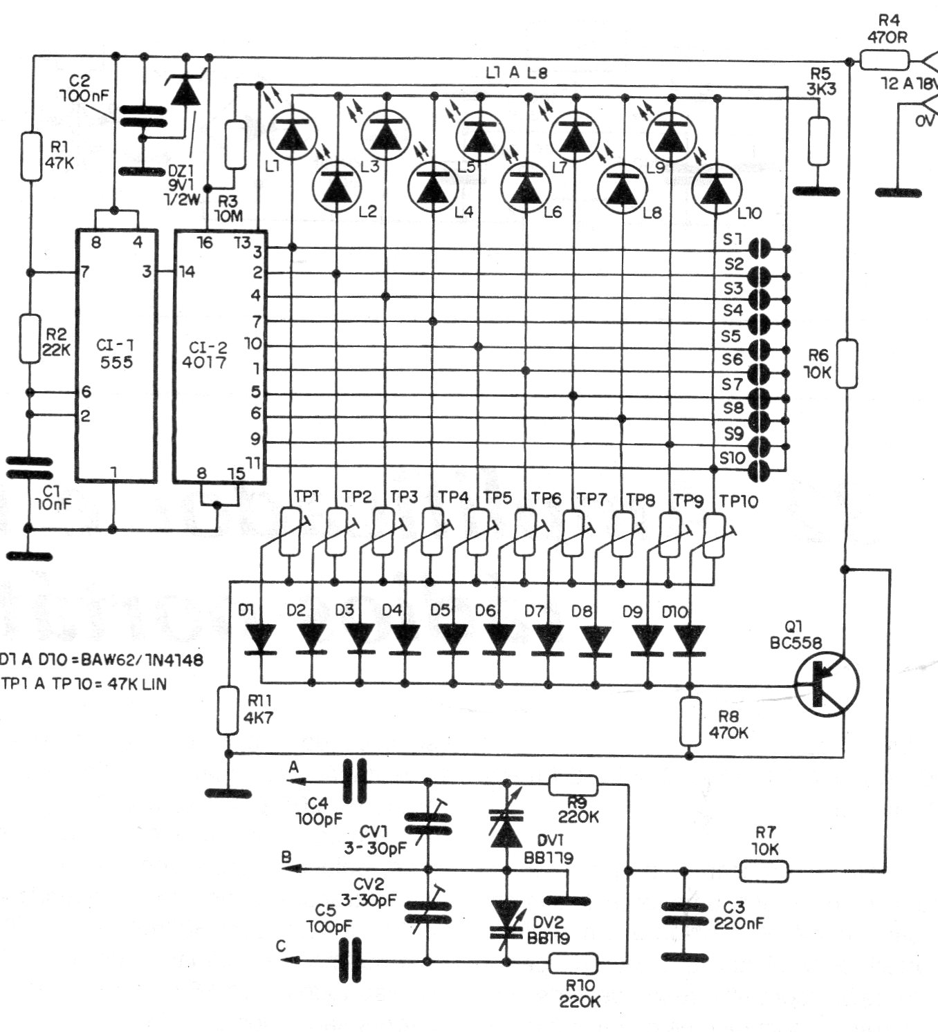 Originalmente diseñado para ser utilizado en un receptor FM, este circuito de 1990 puede adaptarse a otros tipos de circuitos de altas frecuencias como osciladores y receptores. El circuito hace la sintonización por tacto teniendo 10 opciones cuyas frecuencias se seleccionan en trimpots.