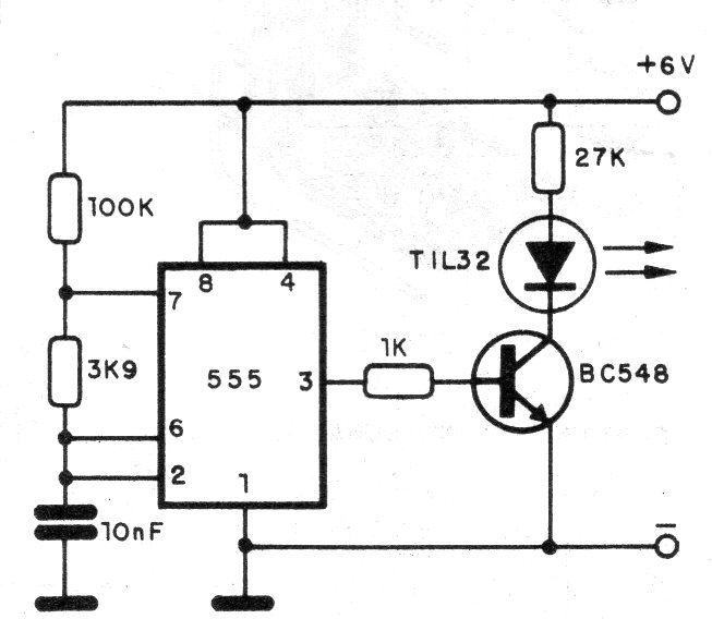 Este circuito, de una documentación de 1990, puede servir como base para un juego de tito al blanco. El receptor se da en el CIR7832S. El circuito produce una señal modulada a partir de un 555 alimentado por una batería de 9 V. El LED emisor debe montarse en un tubo con una lente para una mayor dirección y alcance del disparo.
