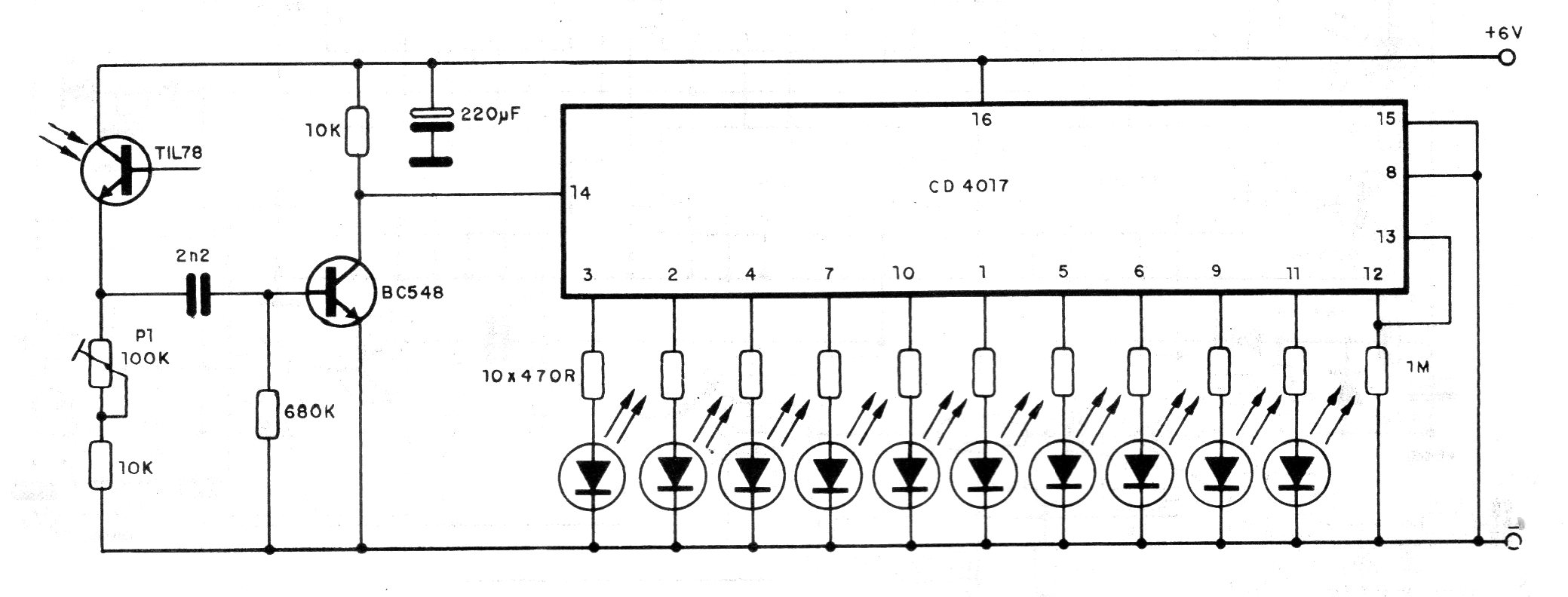 Este circuito es el receptor para el CIR7833S. Se trata de un secuenciador de 10 LED que se activa cuando el foto-transistor recibe un "disparo" de la pistola láser. Este sensor debe colocarse en un tubo en el centro del objetivo. El ajuste de la sensibilidad se realiza en el trimpot. El sensor no debe recibir la luz ambiental directamente.