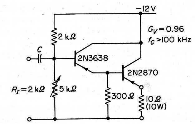 Este circuito es de una documentación 1968. La ganancia de tensión es menor que la unidad, pero la ganancia de corriente es alta. La banda de frecuencias amplificadas sube a 100 kHz. Transistores equivalentes más modernos pueden ser utilizados.
