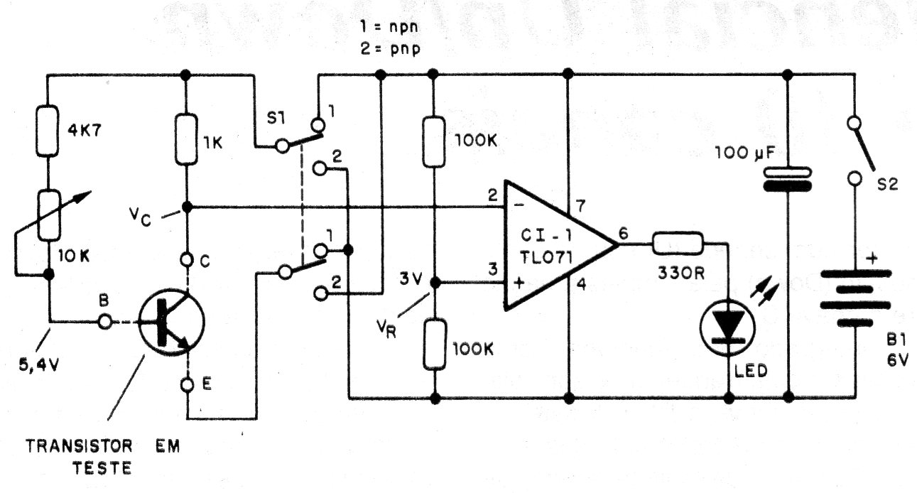 Este circuito es de una documentación de 1990. Utiliza un puente con LEDs y el potenciómetro debe calibrar en términos de hFE según la tabla. El circuito es alimentado por 4 pilas y se puede utilizar con transistores de uso generan, media y alta potencia, además de Darlingtons.